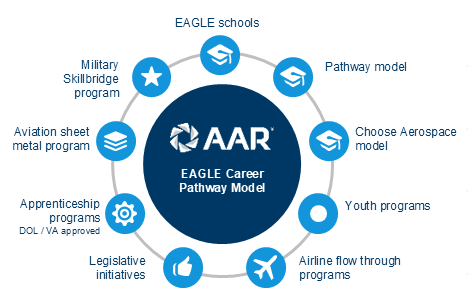The EAGLE Career Pathway model is comprised of serveral different pathway options to careers in aviation. Through its offerings, the EAGLE program is aligned to assist in growing the talent pool necessary to meet the aviation maintenance workforce demands.